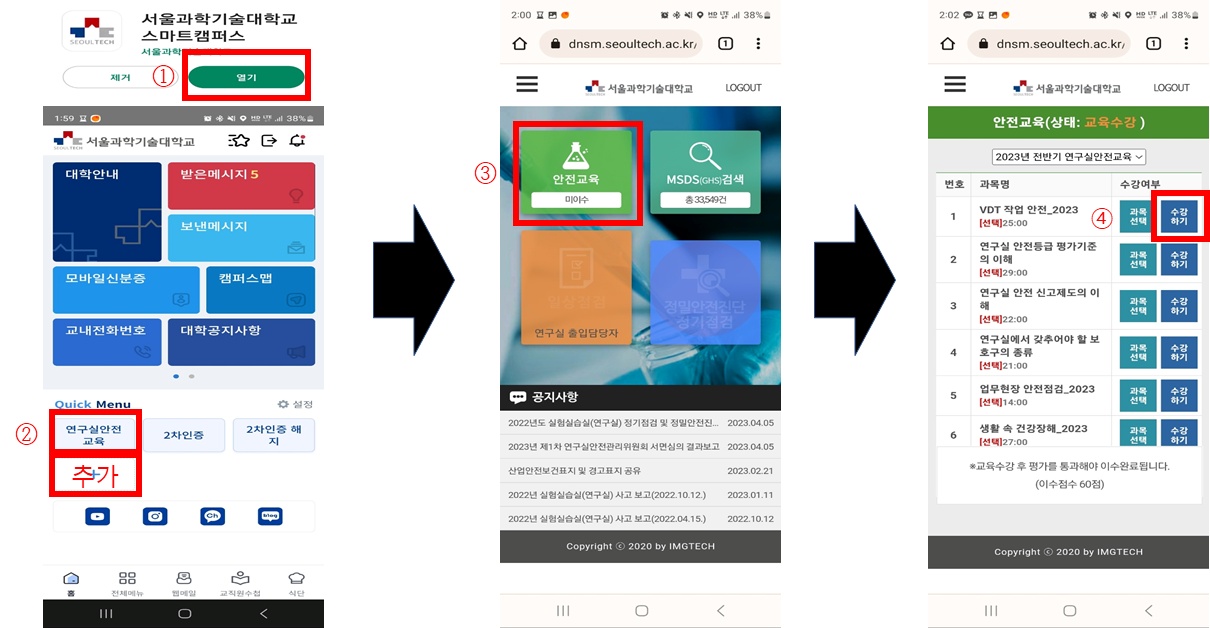 ○ 온라인 안전교육 접속 및 이수방법 - 안전관리시스템 서버접속 -> 포털 계정 로그인 -> 연구실안전교육(온라인) -> 수강 및 이수 ※ 교육시간 수강 완료 후, 평가시험 60점 이상 득점(재시험 가능) - 온라인 안전교육 사이트: https://dnsm.seoultech.ac.kr\ - 모바일 안전교육 접속방법